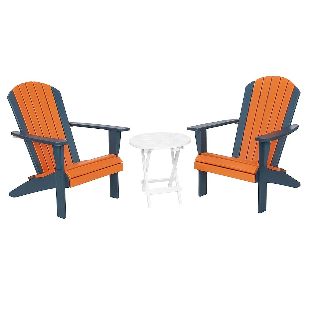 Ensemble de chaises Adirondack en plastique orange et bleu avec table ronde blanche